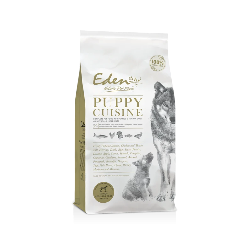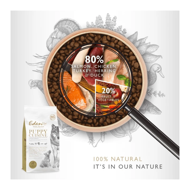 Puppy Cuisine combine des ingrédients entièrement naturels (la marque de fabrique Eden) et une teneur élevée en viande de haute qualité.