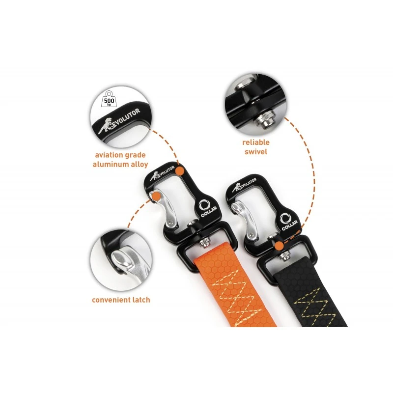 • Mousqueton à pivot visant à empêcher toute torsion de la laisse.